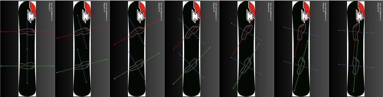 The diagram below shows how, for a fixed stance distance, increasing the binding angles changes the relative position of the feet.