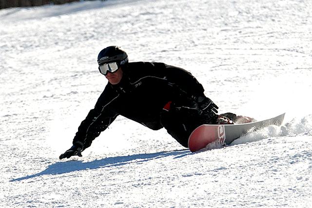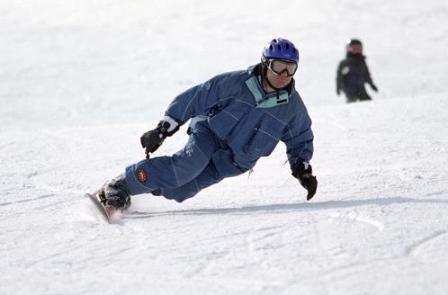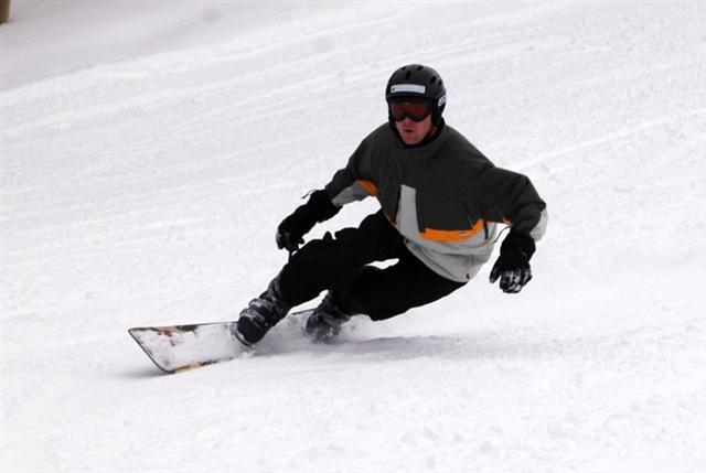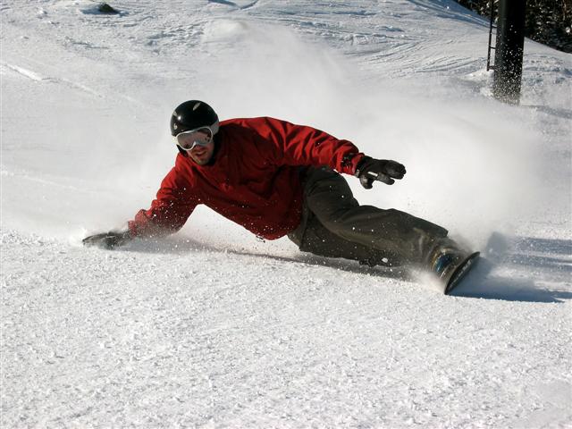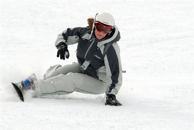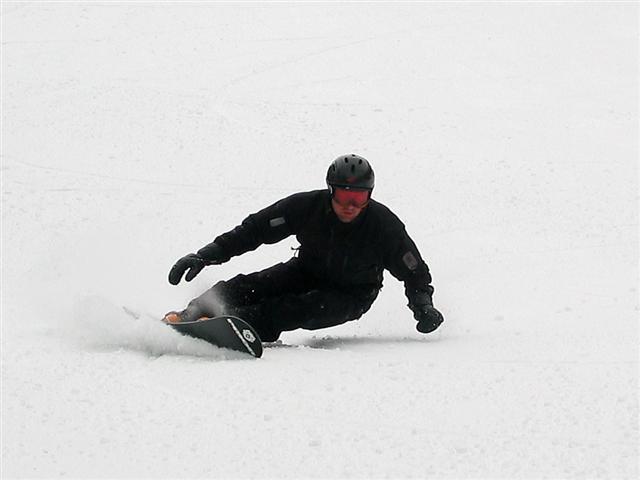 The hips are up and out. This is the exact opposite of what usually happens naturally on heelside. This is an unbalanced position. The center of gravity is high, so to compensate the rider tilts their upper body down into the carve, and reaches for the snow. Be not ashamed if you ride like this. It is very common, and it is the natural result of innate defense mechanisms. We have ALL been there. It just takes a little concentration and some practice to overcome it. This problem is typical among new and intermediate carvers, and it often stays with people well after they have progressed to advanced or even expert status. It is possible to work around this and learn how to carve fairly strongly and even to layout carves low to the ground with one’s tush up on display. However odds are that even expert carvers who ride like this would confess they favor their heelside carves.